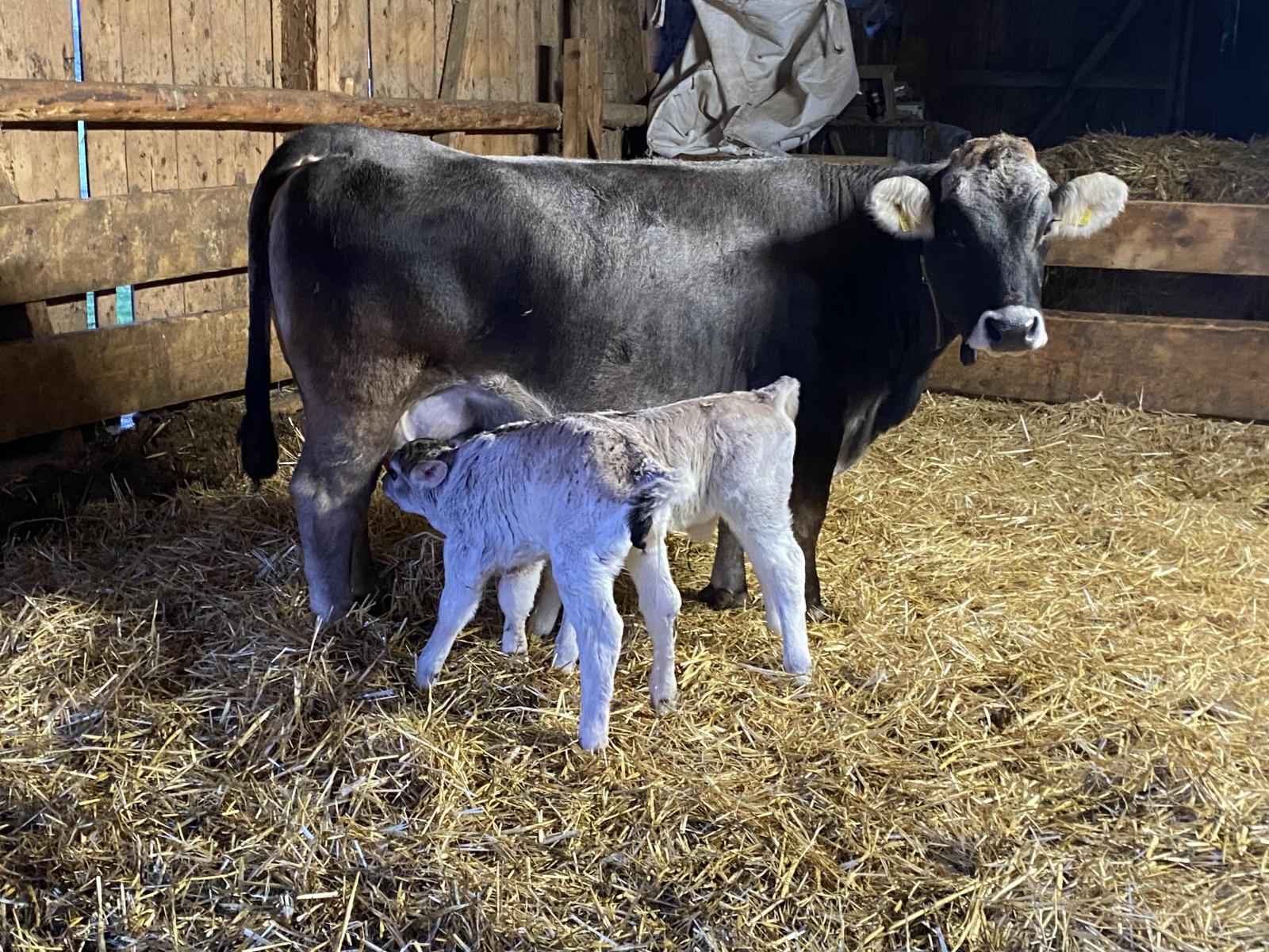 Natürlich Hornlos Grauviehkuh mit Zwillingen.